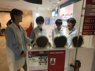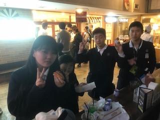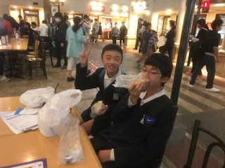 メガネショップの仕事体験の様子です。体験して作った食べ物は、ベンチ等で座ってその場で食べることができます。早速、仕事体験をして作ったものを食べています。