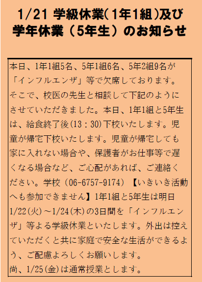 1/21 学級休業(1年1組)及び学年休業(5年生)のお知らせ