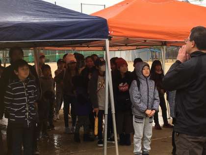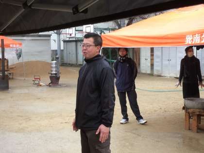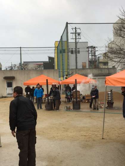 1月21日(日)に、巽南小学校運動場で、「ふれあいもちつき大会」が行われました。午前7時、朝早くからから、PTA・地域の方々が、子どもたちのためにもちつきができるように準備していただきました。