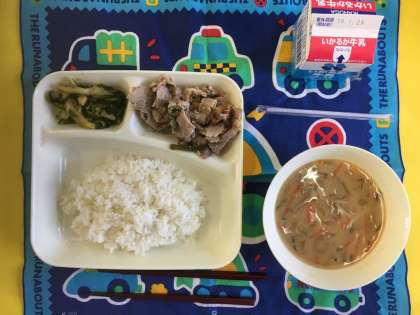 豚肉のごまだれ焼き、みそ汁、きくなとはくさいのおひたし、ご飯、牛乳