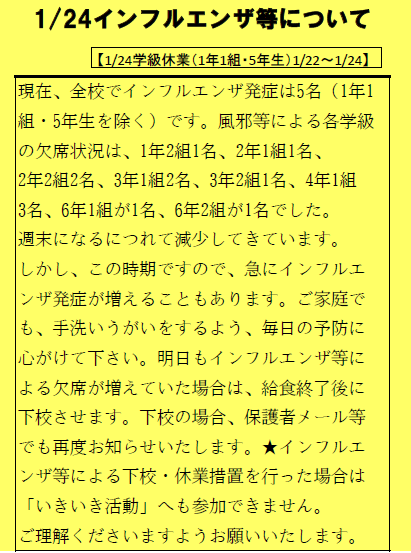 【学級休業1/22〜1/24(1年1組・5年生)】