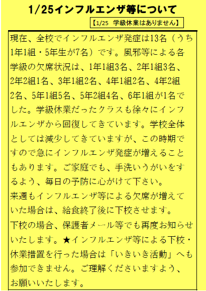現在、全校でインフルエンザ発症は13名(うち1年1組・5年生が7名)です。