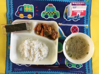 酢豚、ワンタンの皮のスープ、焼きのり、ご飯、牛乳