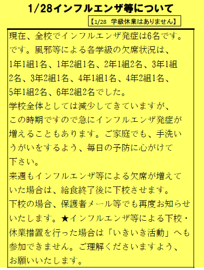 【1/28学級休業はありません】現在、全校でインフルエンザ発症は6名です。風邪等による各学級の欠席状況は、1年1組1名、1年2組1名、2年1組2名、3年1組2名、3年2組1名、4年1組1名、4年2組1名、5年1組2名、6年2組が2名でした。