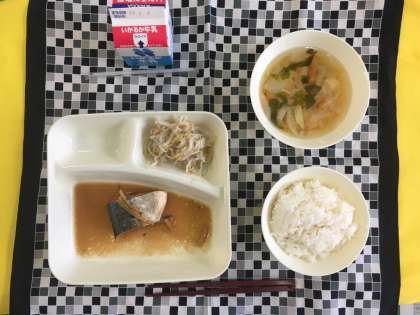 さばのみそ煮、五目汁、もやしの甘酢あえ、ご飯、牛乳