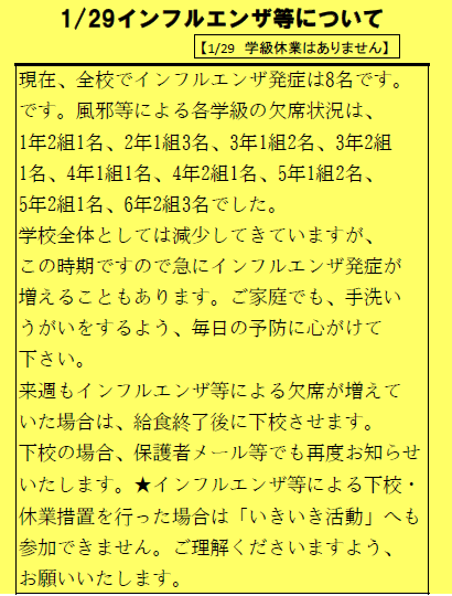 明日もインフルエンザ等による欠席が増えていた場合は、給食終了後に下校させます。下校の場合、保護者メール等でも再度お知らせいたします。