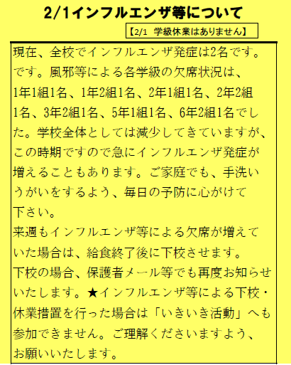 2/1 本日の下校時間(1時頃)とインフルエンザ等について