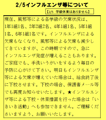 明日もインフルエンザ等による欠席が増えていた場合は、給食終了後に下校させます。 下校の場合、保護者メール等でも再度お知らせいたします。