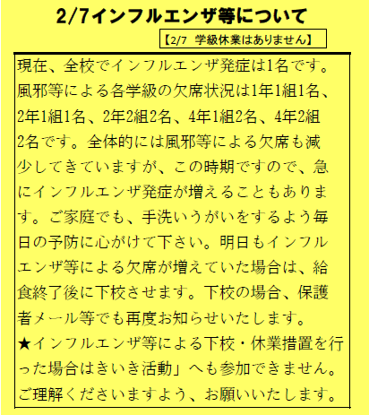 現在、全校でインフルエンザ発症は1名です。風邪等による各学級の欠席状況は、1年1組1名、2年1組1名、2年2組2名、4年1組2名、4年2組2名でした。全体的に風邪等による欠席も減少してきていますが、この時期ですので、急にインフルエンザ発症が増えることもあります。ご家庭でも、手洗いうがいをするよう、毎日の予防に心がけて下さい。