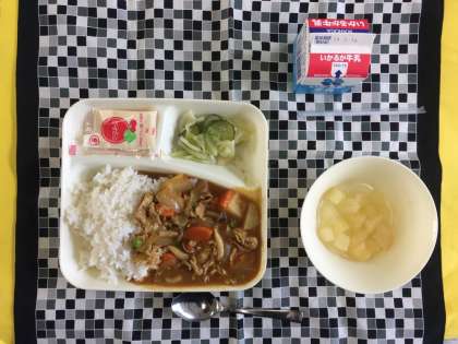 豚肉、じゃがいも、たまねぎ、にんじん、グリンピース、トマト缶、しめじ、にんにくの入ったカレーライスです。子どもたちに人気の献立です。