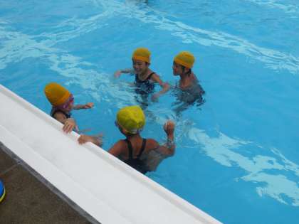 自由練習と水遊びです。水遊びは、水に慣れるための大切な活動です。