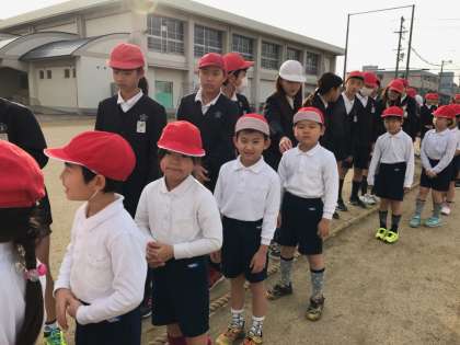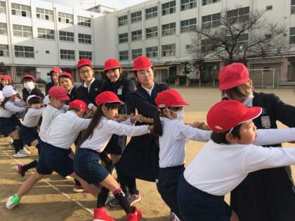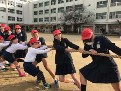 なかよし集会のつな引きは、1年1組と6年1組、1年2組と6年2組がそれぞれペアになってつなを引きます。