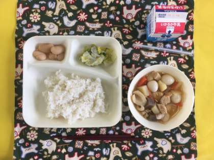 関東煮、はくさいの甘酢あえ、白花豆の煮もの、ご飯、牛乳