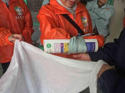 応急処置の訓練もしました。身近な物を利用した応急処置の方法で、雑誌・ネクタイを利用した固定方法を教えていただきました。