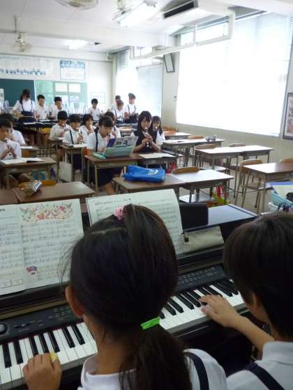 休み時間から音楽室にやって来て、木琴や鉄琴、ピアノの練習をします。普段から楽器演奏が大好きな子ども達。上手に合奏していました。