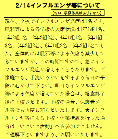 【2/14学級休業はありません】現在、全校でインフルエンザ発症は1名です。風邪等による各学級の欠席状況は、1年1組1名、1年2組1名、2年2組2名、4年1組1名、5年1組3名、5年2組2名、6年1組2名、6年2組1名でした。 学校全体としては減少してきていますが、この時期ですので、急にインフルエンザ発症が増えることもあります。ご家庭でも、手洗いうがいをするよう、毎日の予防に心がけて下さい。