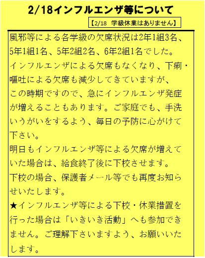 明日もインフルエンザ等による欠席が増えていた場合は、給食終了後に下校させます。下校の場合、保護者メール等でも再度お知らせいたします。