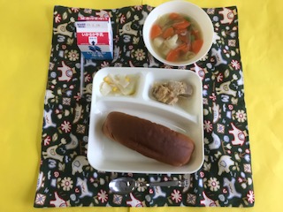 まぐろのしょうゆマヨネーズ焼き、鶏肉とじゃがいものスープ煮、だいこんのサラダ、