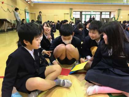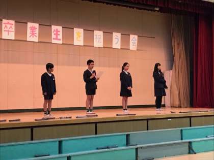 今年度の「卒業生を祝う会」では、1年生から6年生が縦割り班になって一緒にゲームに取り組みました。