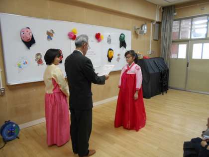 昨日、国際クラブの修了式を行いました。校長先生・金ソンセンニムより修了証書をいただきました。6年生のみなさん、修了おめでとうございます。6年生が在校生たちにしっかりとメッセージを伝えました。修了式後は、保護者の方のご協力で茶話会を行いました。