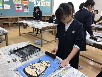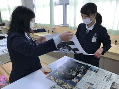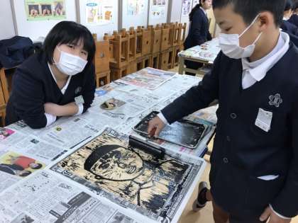 友だちと協力して版にインクをつけて、紙を上から重ねます。