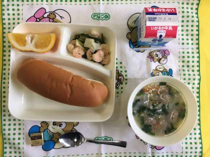 えびとチンゲンサイのいためもの、中華がゆ、はっさく、コッペパン、いちごジャム、牛乳