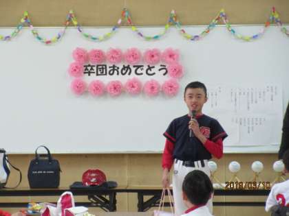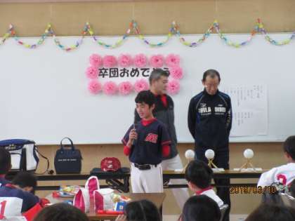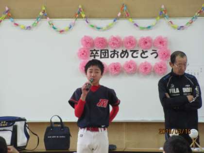 卒業生が1人ずつあいさつをしました。1人1人が、1〜5年生に向けての激励の言葉や保護者や監督・コーチへの感謝の言葉など、それぞれの思いをしっかりと話していました。とても立派でした。