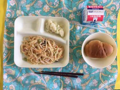 さけのクリームスパゲッティ、カリフラワーのサラダ、黒糖パン小、牛乳