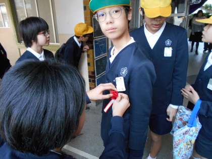 1枚目は、5年生に胸花をつけてもらっている様子です。