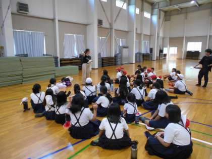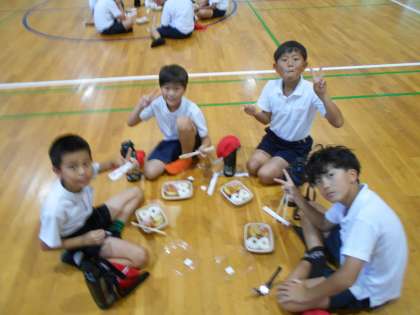 バスの到着が早かったので、予定を入れ替えて、先に体育館で昼食のお弁当を食べることになりました。