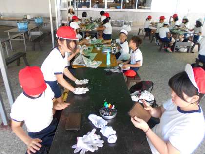 まず、たわしですすを落とし、続いて丁寧に板を磨きました。