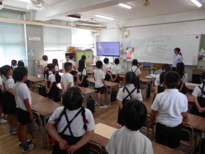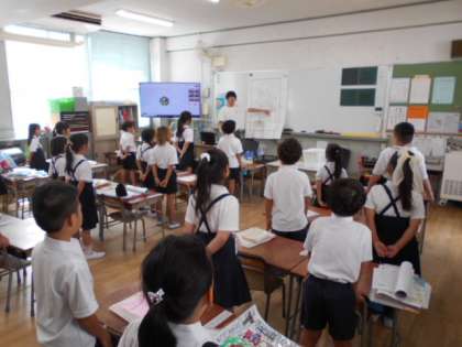 2学期頑張んばりたいことの発表を聞いた後、校歌を歌いました。低学年の元気な歌声が、職員室まで響いていました。