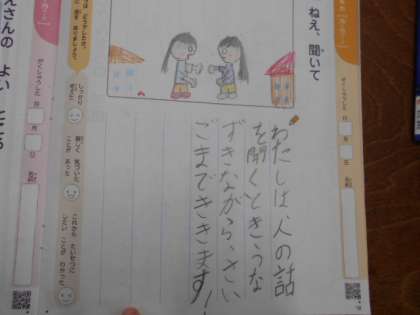道徳で「ねえ、聞いて」の学習をしていました。話を聞いてもらえた時の主人公の気持ちから、自分が誰かに話しかけられえたとき、どんなふうに聞こうと思うかという質問に、「うなずきながら」「話し終わるまで声をゼロにして」「相手の話が終わってから、自分が話す」など、聞き方名人がたくさんいました。