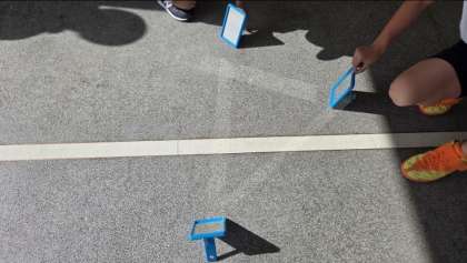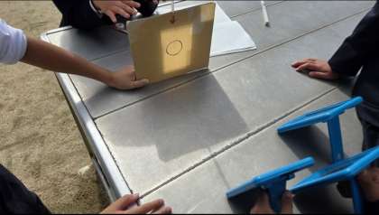 3年生は、光のせいしつについて学習しています。日光をかがみではね返して、光の進み方を観察しました。また、かがみの枚数を変えた時の明るさや温かさの変化を調べました。