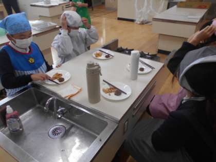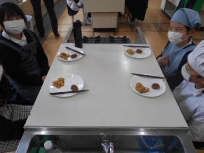 だしや調味料の煮詰まるいい匂いが家庭科室に立ち込め、出来上がりです。