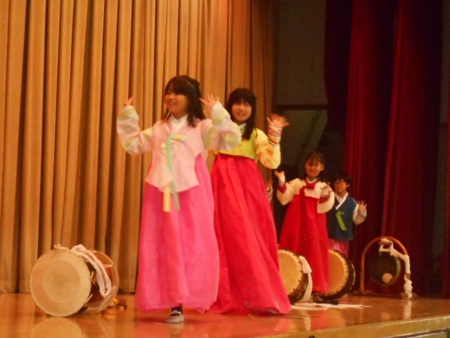 楽器の紹介や、演奏があったり、「トッケビジャンケン」を一緒にしたりしました。国際クラブのみんなも、一生懸命練習した成果を出し切ってくれました。会場中から「楽しかった!!」という声と拍手が沸き起こりました。