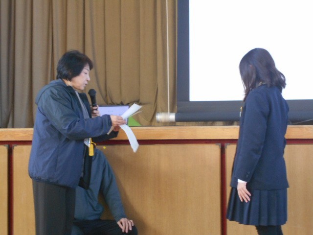 児童集会の後、読書感想文コンクールで読書感想文協会賞を受賞した4人の表彰がありました。