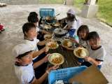 みんなで盛り付けをしたカレーを食べています。 みんな笑顔です。