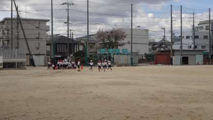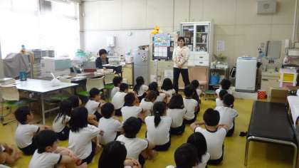 2年生が体育で50m走を計測している様子と、4年生が発育測定前に先生からお話を聞いている様子です。