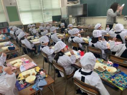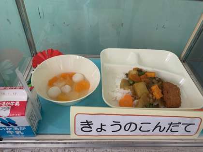 今日は入学祝い献立です。カレーには、ハートやクマの形をしたラッキーにんじんが入っています。ラッキーにんじんを見つけた児童はとても喜んでいました。