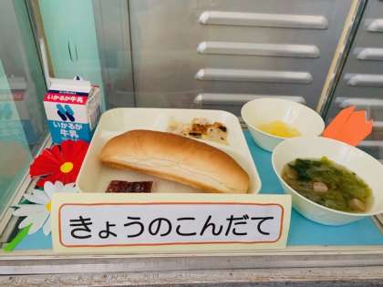 マカロニグラタン、レタスのスープ、りんご(かんづめ)、コッペパン、いちごジャム、牛乳