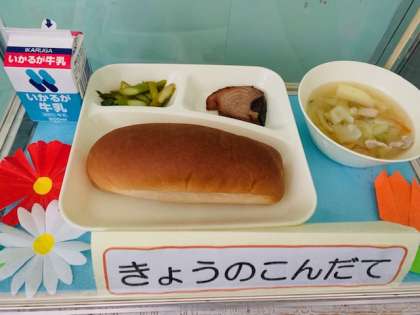 かつおのガーリック焼き、鶏肉とじゃがいものスープ、グリーンアスパラガスのサラダ、黒糖パン、牛乳