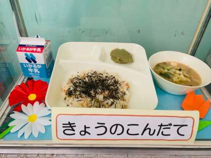 かやくご飯、みそ汁、まっ茶ういろう、牛乳