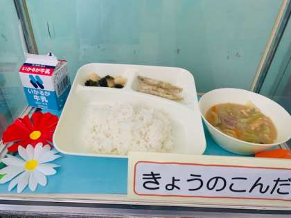 きびなごてんぷら、豚汁、わかたけ煮、ごはん、牛乳