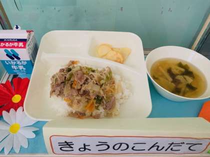 豚丼、湯葉のすまし汁、焼きじゃが、ごはん、牛乳