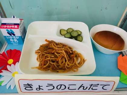 スパゲッティミートソース、きゅうりのバジル風味サラダ、黒糖ロール、牛乳