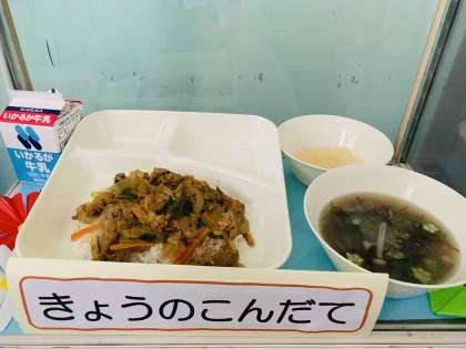 和風カレー丼、もずくとオクラのとろり汁、和なし(かんづめ)、牛乳