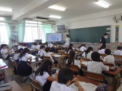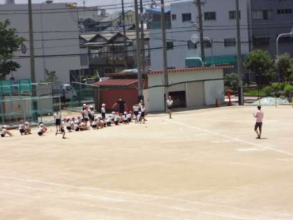 ソフトボール投げの記録を測定したり、外国語活動をしたりしています。