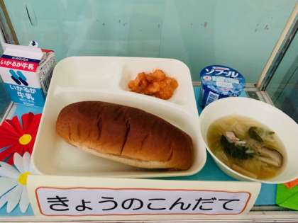 えびのチリソース、中華スープ、ヨーグルト、黒糖パン、牛乳