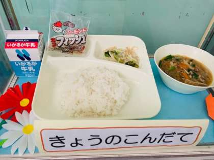 マーボーはるさめ、チンゲンサイともやしの甘酢あえ、アーモンドフィッシュ、ごはん、牛乳